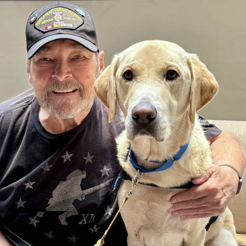 Marty, a one-year-old “wild child” who lacked any prior socialization and training was rescued from the shelter. After receiving his training at OC Probation, and finishing his advanced training with Cell Dog’s service dog trainer, he is now placed with his partner as a certified service dog. Terry, a Vietnam Veteran who was an Army Medic, at just 18-years-old, suffers from severe PTSD.